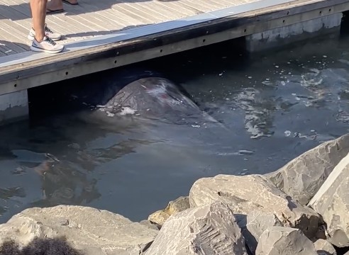 ORBETELLO – Tragica fine per un grosso cetaceo, del peso di circa otto tonnellate, rimasto incastrato ieri nel porto di Talamone.