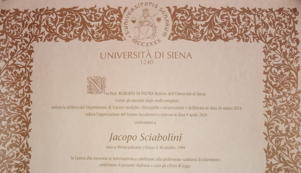 La pergamena è stata consegnata ai genitori da Paola Piomboni, delegata alla didattica del rettore Di Pietra, e dal presidente del corso Luigi Gennari durante la sessione di laurea al Centro didattico del Policlinico Le Scotte di Siena, una cerimonia alla quale hanno partecipato anche il fratello e gli amici di Jacopo.