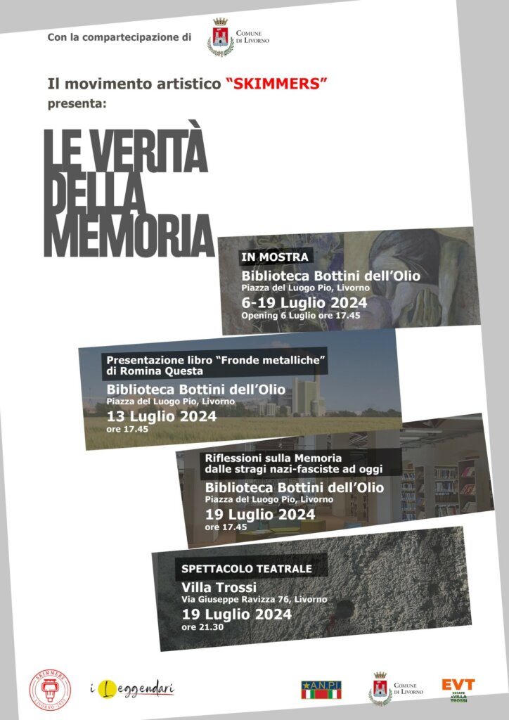 In occasione della ricorrenza dell’ottantesimo anniversario delle stragi nazifasciste del ’44 e dell’anniversario della Liberazione della città di Livorno, 19 luglio 1944 il movimento artistico Skimmers in collaborazione con A.N.P.I sezione di Livorno con la compartecipazione del Comune di Livorno presenta ‘Le verità della memoria: mostra d’arte, fotografia, scultura e teatro’.