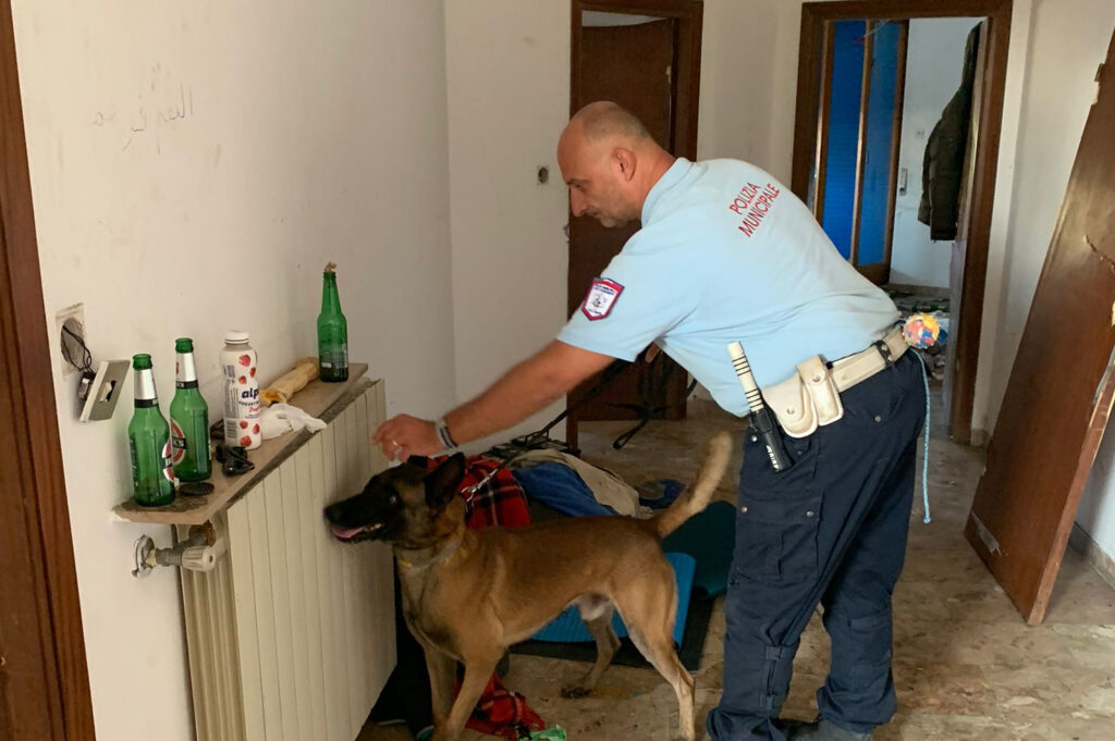 Gli agenti della municipale hanno inoltre proceduto a un controllo della struttura con le unità cinofile e i cani Van Basten e Destroy che hanno rinvenuto alcune modiche quantità di hashish nascoste in vari punti del fabbricato.