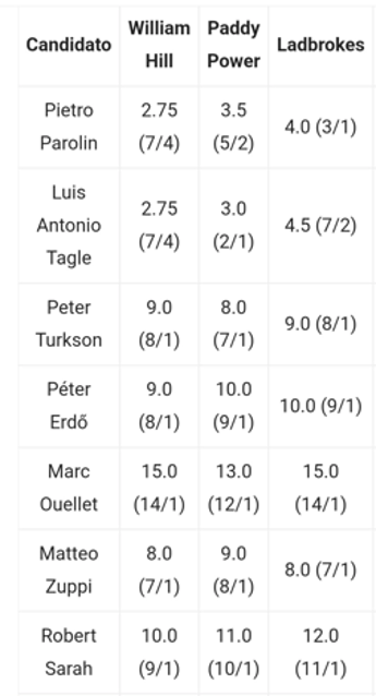 (Adnkronos) – Conclave alle porte, cresce l’attesa — e le scommesse — su chi sarà il prossimo successore di Papa Francesco. Secondo i dati della piattaforma Polymarket, queste sono le probabilità più accreditate: Pietro Parolin: 36–40%, Luis Antonio Tagle: 26–40%, Matteo Zuppi: 7–14%, Péter Erdő: 7–11%, Peter Turkson: 5–9%, Robert Sarah: 2–3%, Raymond Burke: 1–2% Il mondo cattolico guarda con attenzione a Roma, i bookmaker hanno già messo le carte sul tavolo. Le quote per il successore di Papa Francesco sono online, e i candidati più papabili — letteralmente — stanno già facendo parlare di sé non solo per i loro meriti ecclesiastici, ma anche per le scommesse che girano attorno ai loro nomi. In testa troviamo due nomi noti: Pietro Parolin e Luis Antonio Tagle. Entrambi sono quotati da William Hill a 2.75 (7/4), mentre Paddy Power offre 3.5 (5/2) per Parolin e 3.0 (2/1) per Tagle. Anche Ladbrokes li tiene d'occhio con quote rispettivamente di 4.0 (3/1) e 4.5 (7/2). La lotta tra l’italiano e il cardinale filippino è apertissima. Piccola nota: entrambi godono di buona considerazione per il fronte progressista e, per più d'un osservatore, si porrebbero in continuità con il papato di Francesco. Subito dopo troviamo Peter Turkson e Matteo Zuppi, due figure molto differenti ma con posizionamenti simili: quote tra 7/1 e 9/1. Turkson, ghanese e da tempo indicato come possibile primo Papa africano moderno, è dato a 9.0 (8/1) su William Hill, mentre Zuppi, l’arcivescovo di Bologna noto per il suo posizionamento profressista, si gioca a 8.0 (7/1). Non manca Péter Erdő, cardinale ungherese che gode di grande considerazione nei circoli più conservatori, quotato tra 8/1 e 10/1. Nel gruppo degli "sfavoriti" troviamo Marc Ouellet e Robert Sarah. Il canadese è dato fino a 15.0 (14/1), mentre il guineano Sarah oscilla tra 10.0 e 12.0 (9/1 – 11/1). Quote più alte, ma in un conclave… tutto può succedere. (di Andrea Persili) —finanzawebinfo@adnkronos.com (Web Info)
