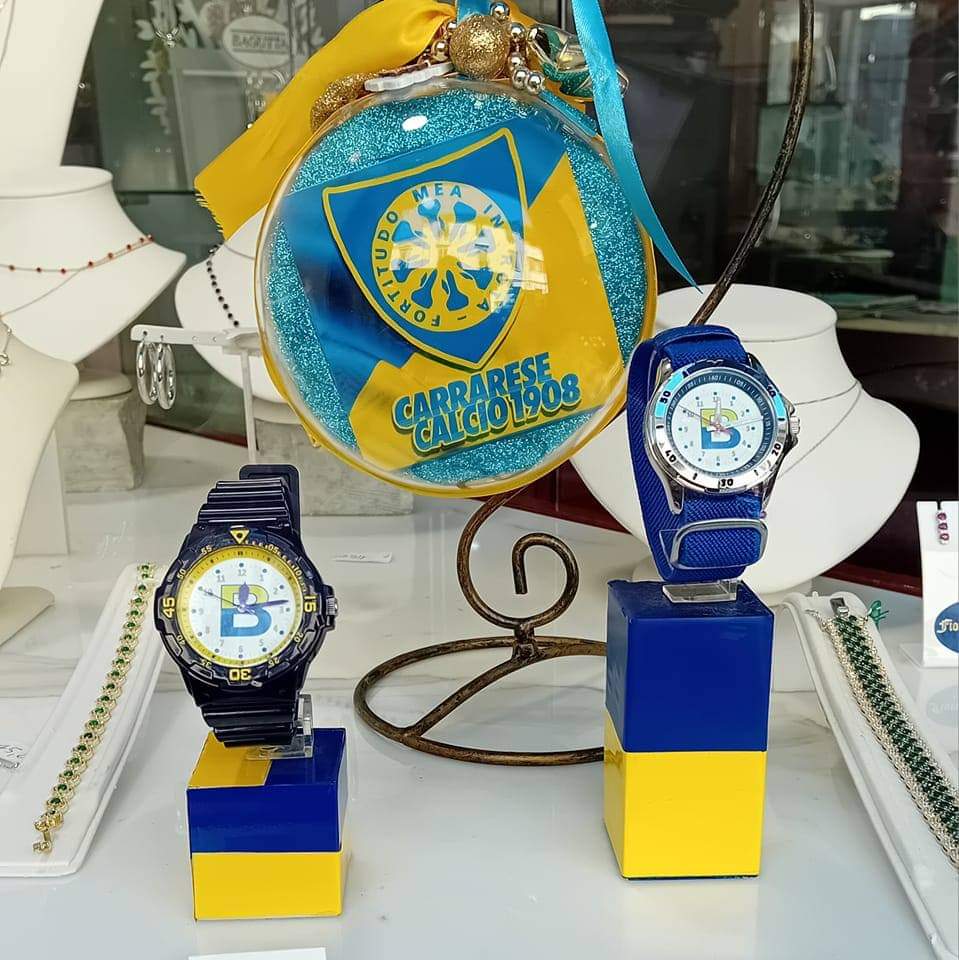 Poi le richieste da parte della cittadinanza crescono giorno per giorno: “Sempre più tifosi mi hanno contattata per avere l’orologio, che ha un prezzo abbordabile ed è fatto graficamente e soprattutto meccanicamente con materiali di qualità. D’altronde è un pezzo realizzato dopo settantasei anni”. Lucia, allo stadio naturalmente, si porta dietro tutta la famiglia: il consorte Vittorio Tortelli è un conosciuto e apprezzato allenatore di calcio giovanile, i figli Federico e Alessandro sono di fatto cresciuti tra Via Roma e lo stadio cittadino. Anche mamma Anna e una grande tifosa dei marmiferi, ma soltanto l’età la frena dal partecipare alla liturgia domenicale di casa Fiori – Tortelli: “Ho investito un po’, perché credo in questo questo progetto, e dal 2019 mi sono buttata sulla linea di prodotti dedicati alla mia Carrarese. In quell’anno arrivammo ai playoff con mister Baldini, poi è stato un crescendo. Il commercio carrarino vive un momento di difficoltà, ma nei momenti di difficoltà questa città sa alzare la testa, e in fondo una promozione in cadetteria rappresenta una vetrina, è proprio il caso di dirlo, per tutta Carrara, non soltanto per la gioielleria Fiori”.