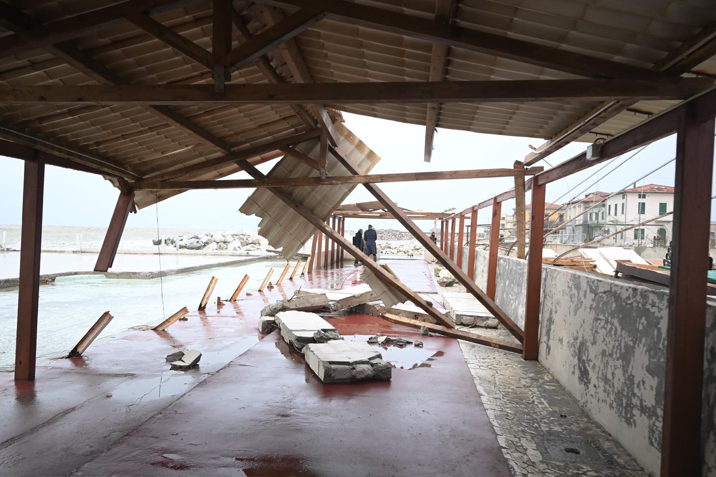 A Livorno il lungomare invaso dal mare, che ha provocato ingenti danni anche alla Terrazza Mascagni, soprattutto alla pavimentazione. Terrazza meta di turisti da tutto il mondo. E allo storico gabbione di uno stabilimento balneare, distrutto dalle onde.