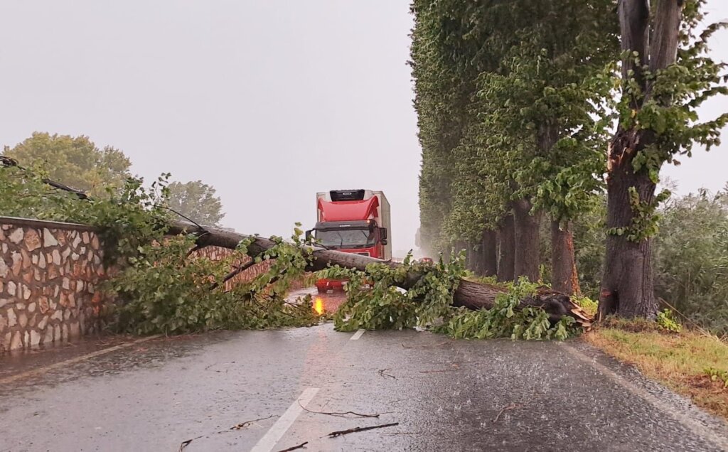 Un violento rovescio ha inoltre colpito San Rossore, dove una tromba d’aria ha abbattuto oltre dieci pini lungo il viale del Gombo, distruggendo alberi secolari.