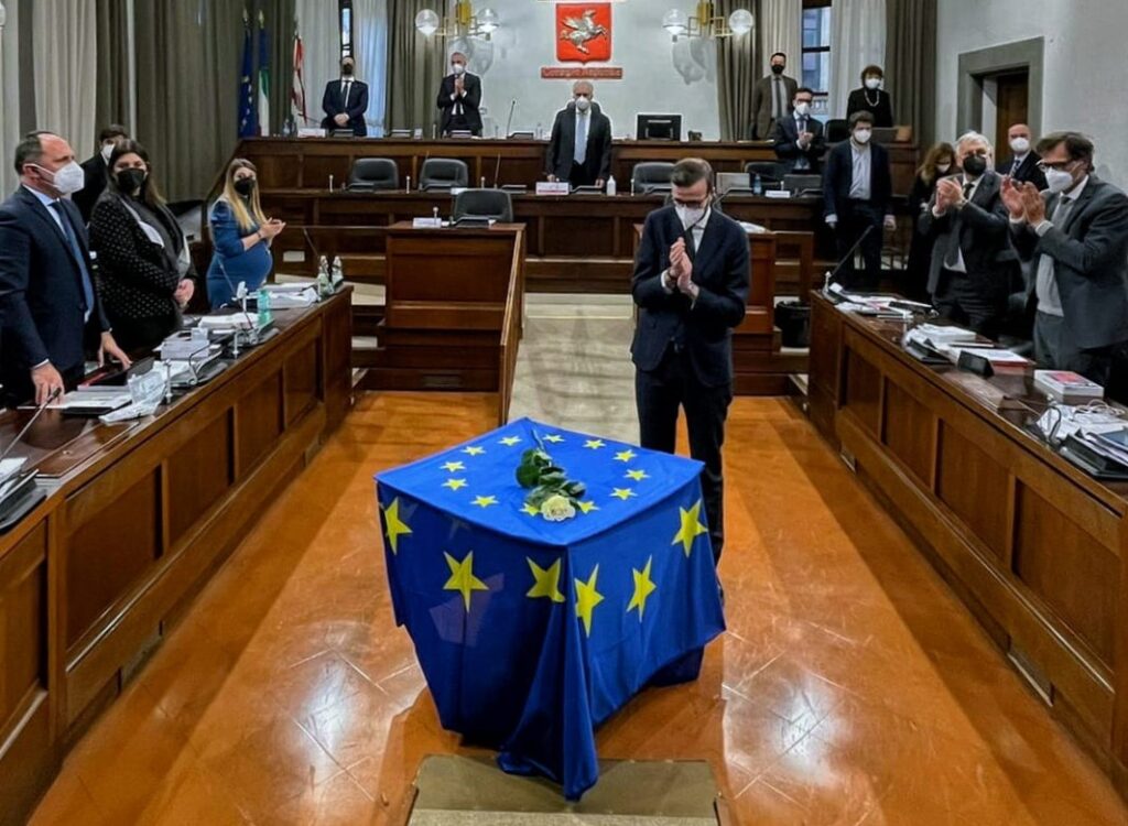Tre uomini dunque. Nella perfetta linea nazionale che vede tra i 58 delegati espressi da ciascuna Regione neanche un 10% di componente femminile. E nemmeno c’è stata discussione in tal senso nell’aula istituzionale toscana. Non fu così nel 2015, quando con l’allora presidente della Regione Toscana Enrico Rossi votarono Mattarella presidente la vicecapogruppo Pd Lucia De Robertis e la portavoce dell’opposizione Stefania Fuscagni, Forza Italia. La Toscana, insieme all’Emilia Romagna, è stata l’ultima regione a sceglieri i tre nomi. In apertura di seduta, una rosa bianca poggiata su un tavolo, accanto alla bandiera blu stellata dell’Unione europea, in memoria di David Sassoli, il presidente del Parlamento Europeo a cui il Consiglio della Regione Toscana intitolerà il Media Center. Poi, il videomessaggio che David Sassoli inviò all’assemblea toscana in occasione della seduta solenne per la Festa dell’Europa, lo scorso 11 maggio, salutato al termine con un lungo applauso.
