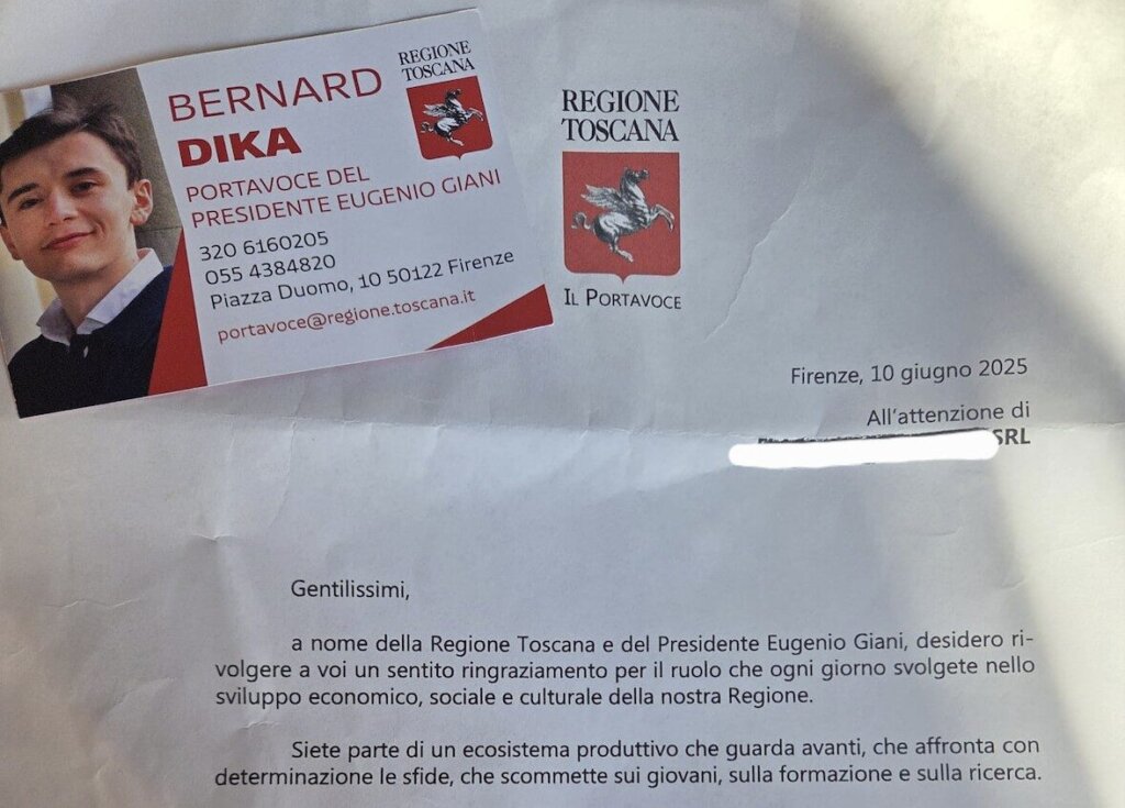 FIRENZE – “Da quanto leggiamo sulla stampa Bernard Dika, portavoce del presidente uscente Eugenio Giani, sarà candidato per il Ccnsiglio regionale con il Pd nel collegio di Pistoia. Come si apprende dalla stampa e dalla ricostruzione di Alberto Vivarelli, solo poche settimane fa, Dika ha spedito, a spese della Regione, un resoconto delle sue attività (169 pagine), corredato da sue foto e biglietti, e anche una bandiera della Regione Toscana. Tutto ciò è stato ricevuto da imprese e cittadini, principalmente, del territorio pistoiese. Quindi, sembrerebbe proprio una campagna istituzionale ritagliata però su quello che, sarà il suo collegio elettorale”. A rivelarlo il comitato promotore della Lista civica È ora! per Tomasi presidente.