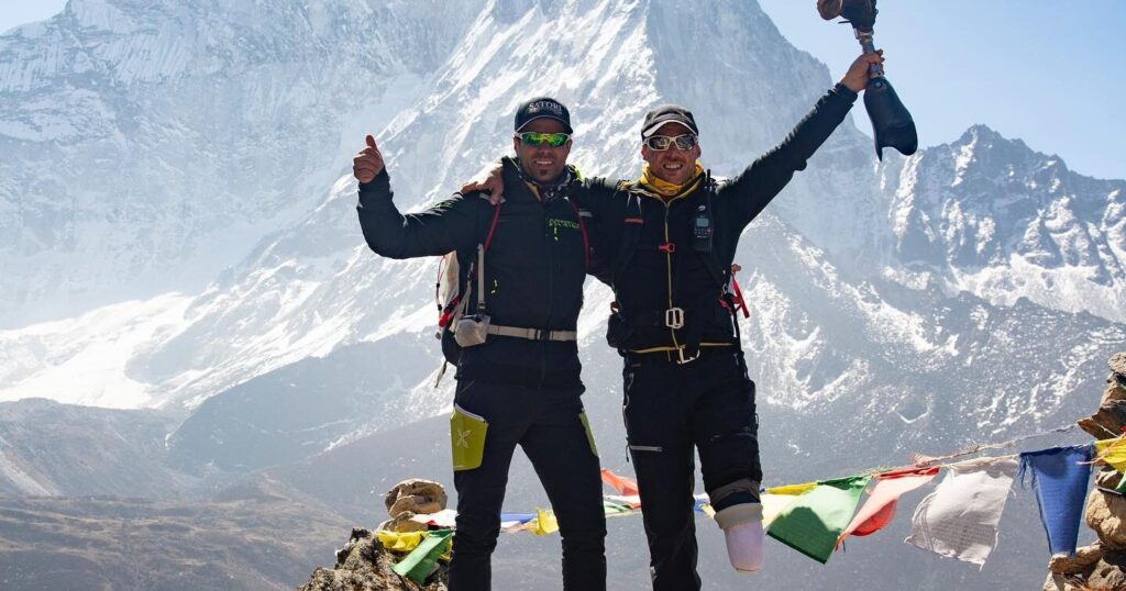 Le protesi al cielo per festeggiare in cima all’Everest.
