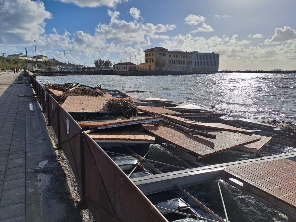 Livorno ampiamente colpita dalle mareggiate nei giorni scorsi. Con danni sul lungomare, circa 300 alberi crollati, Terrazza Mascagni danneggiata con parte della celebre pavimentazione portata via  dalla furia delle onde. E con la celebre statua di Stefano Chia allo Scoglio della Regina spezzata da mare e vento.