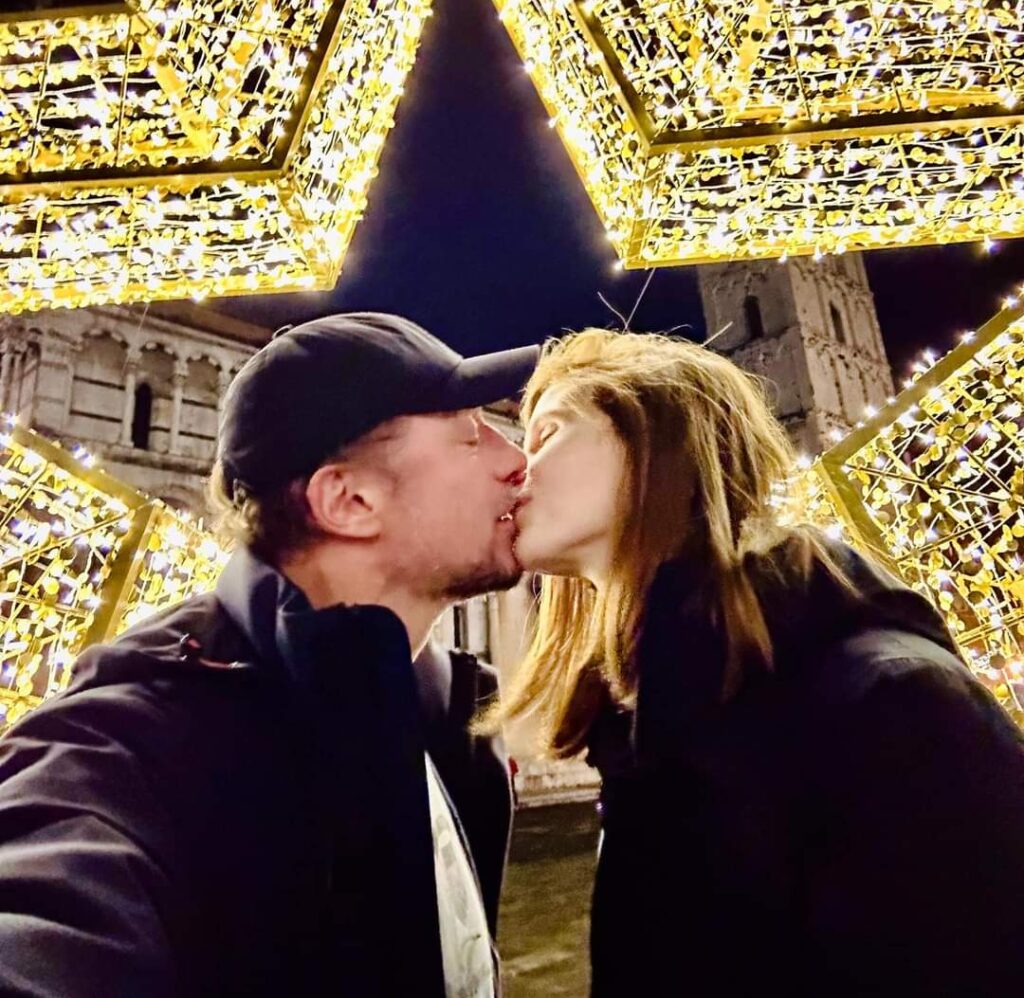 Accorsi ha postato sul proprio profilo Fb il bacio e la dedica alla moglie durante la festa per l’arrivo del nuovo anno a Lucca nella centralissima piazza San Michele.