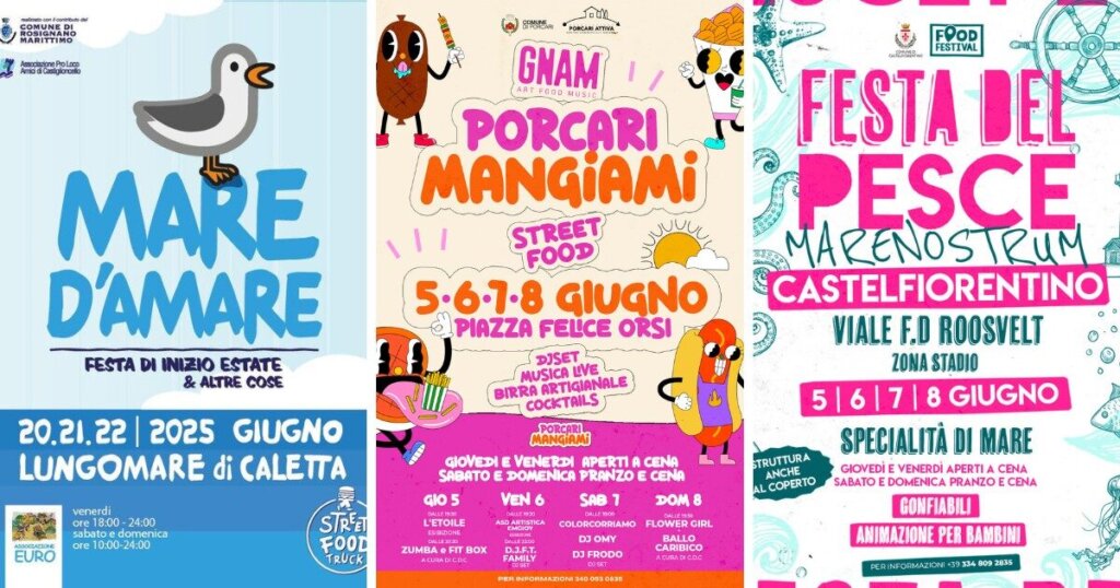 Quattro giorni dedicati allo street food di mare con un’offerta gastronomica ricca e tradizionale: insalate di mare, acciughe marinate, fritture, cacciucco, impepata di cozze e primi piatti a base di pesce. Gli stand, anche al coperto, saranno aperti giovedì e venerdì a cena, sabato e domenica sia a pranzo che a cena. A rendere più vivace l’atmosfera contribuiranno musica, dj set, spettacoli itineranti e attività per bambini. Ingresso gratuito. L’organizzazione è a cura di Food Festival.