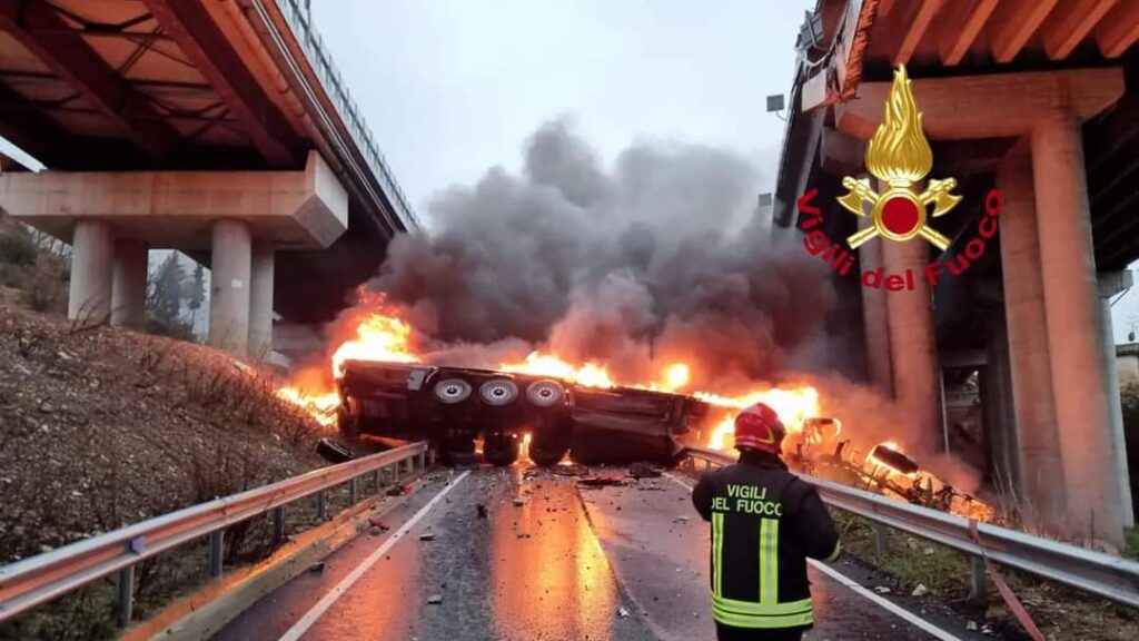 Il tir, per cause da stabilire, ha sbandato andando a sbattere prima contro la barriera centrale della carreggiata e poi, dopo aver attraversato le corsie di sorpasso, di marcia e di emergenza, ha abbattuto sul lato destro del viadotto sei elementi delle protezioni laterali, finendo nel vuoto per un’altezza di oltre 15 metri.